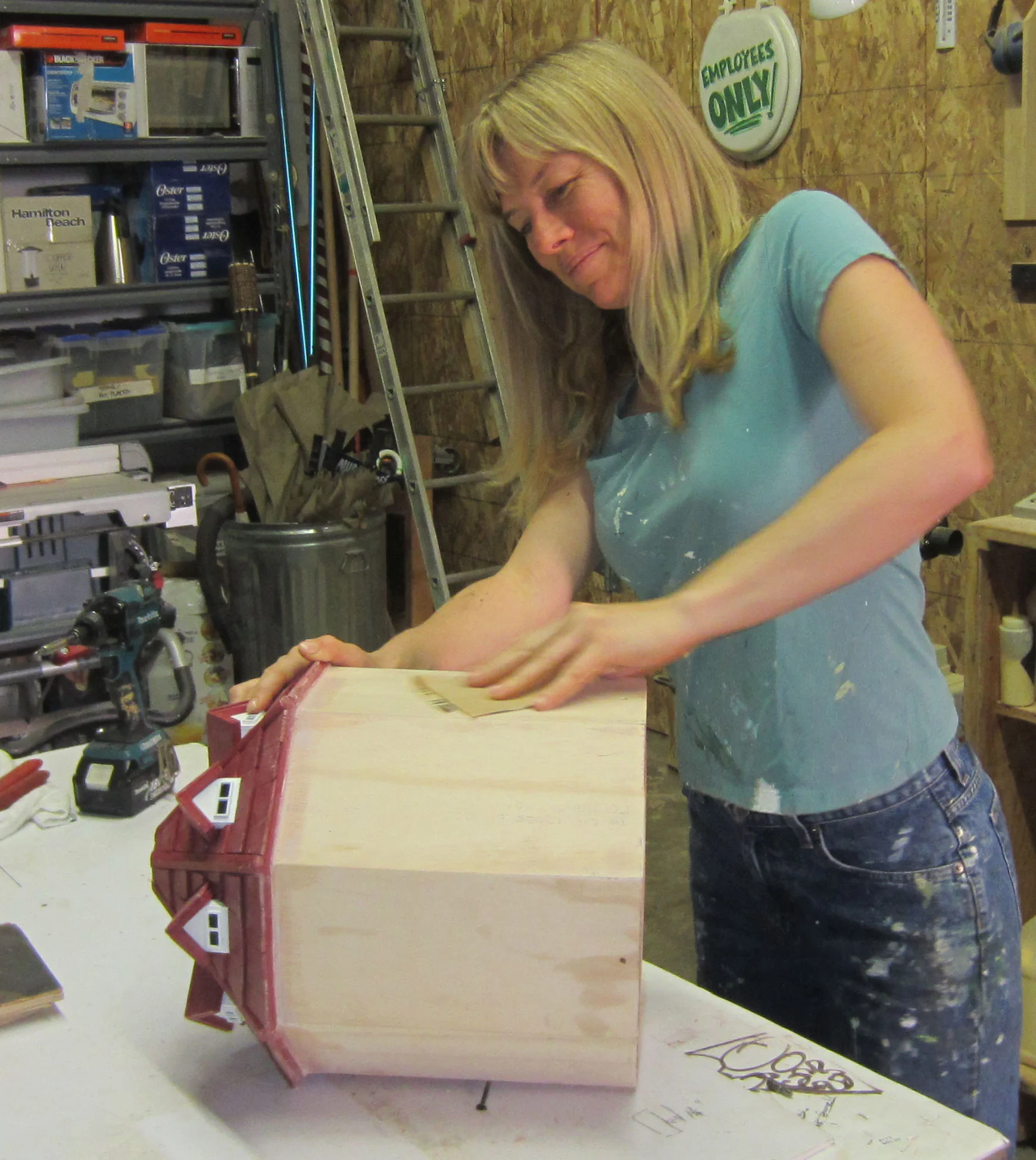 Chris, filing down a window that would be on the outside of the house. I found the windows and door at a store that supplies scale architectural components for dollhouses. They were the perfect scale, suitable for outdoor use and paintable.
