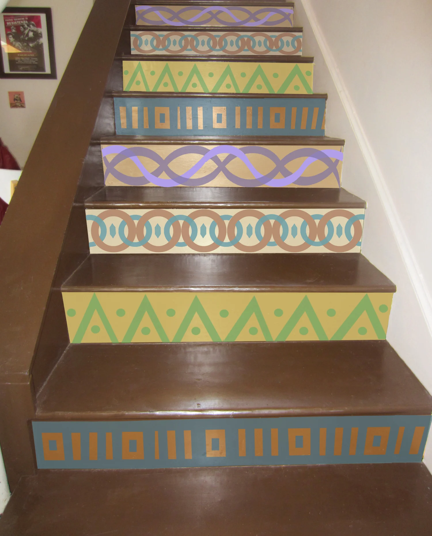 A client of mine and her husband have an adorable house in the Hollywood Hills. They wanted to update some pretty blah stairs that didn't really say anything about their style nor were they particularly fun to look at. I looked around the house and found some other shapes and patterns that were in other fabrics and things they had and came up with this design for them.