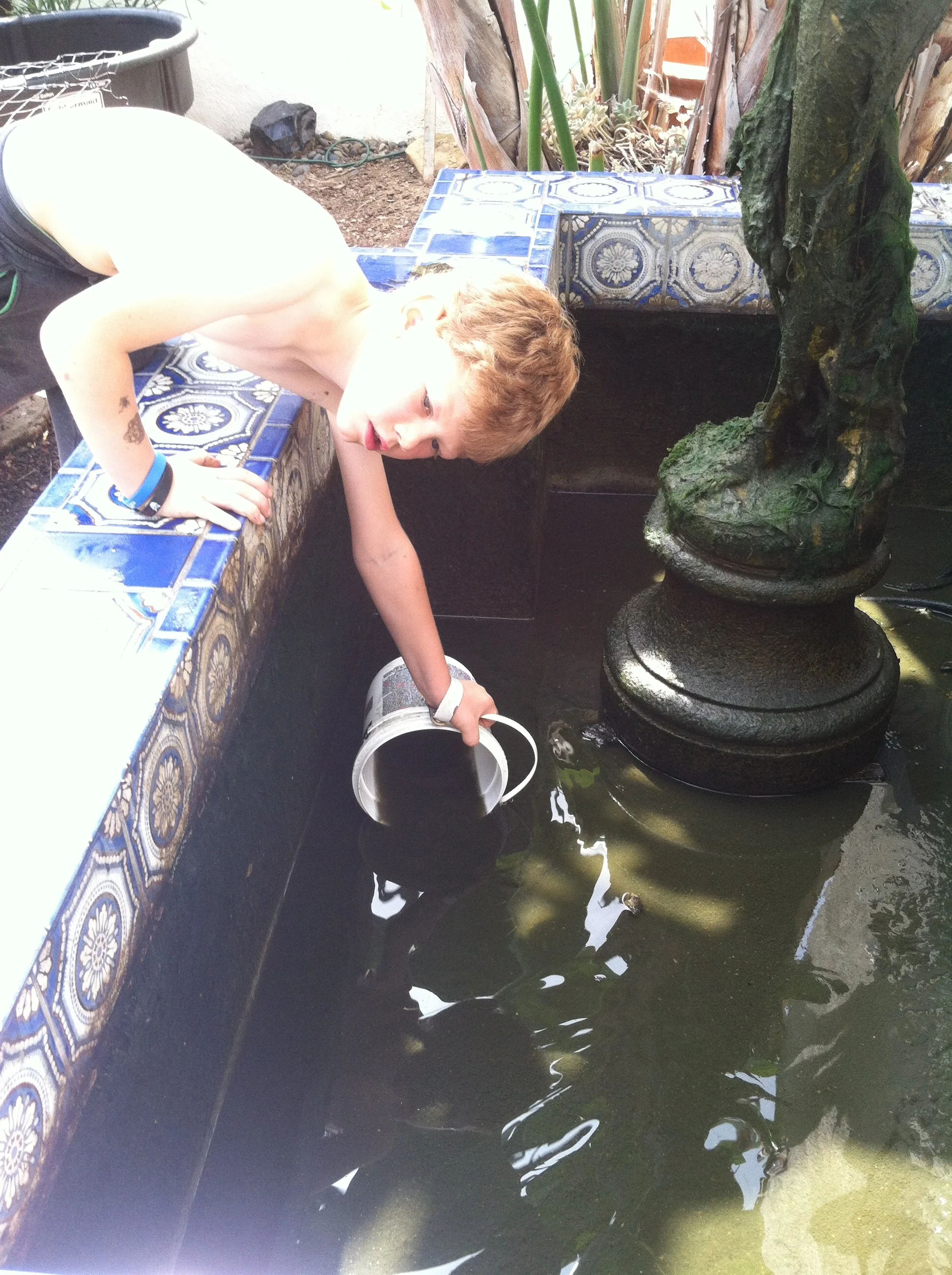 In the meantime, we had to get to work getting the 20 fish out of the pond and into temporary tanks so we could empty and clean the pond.