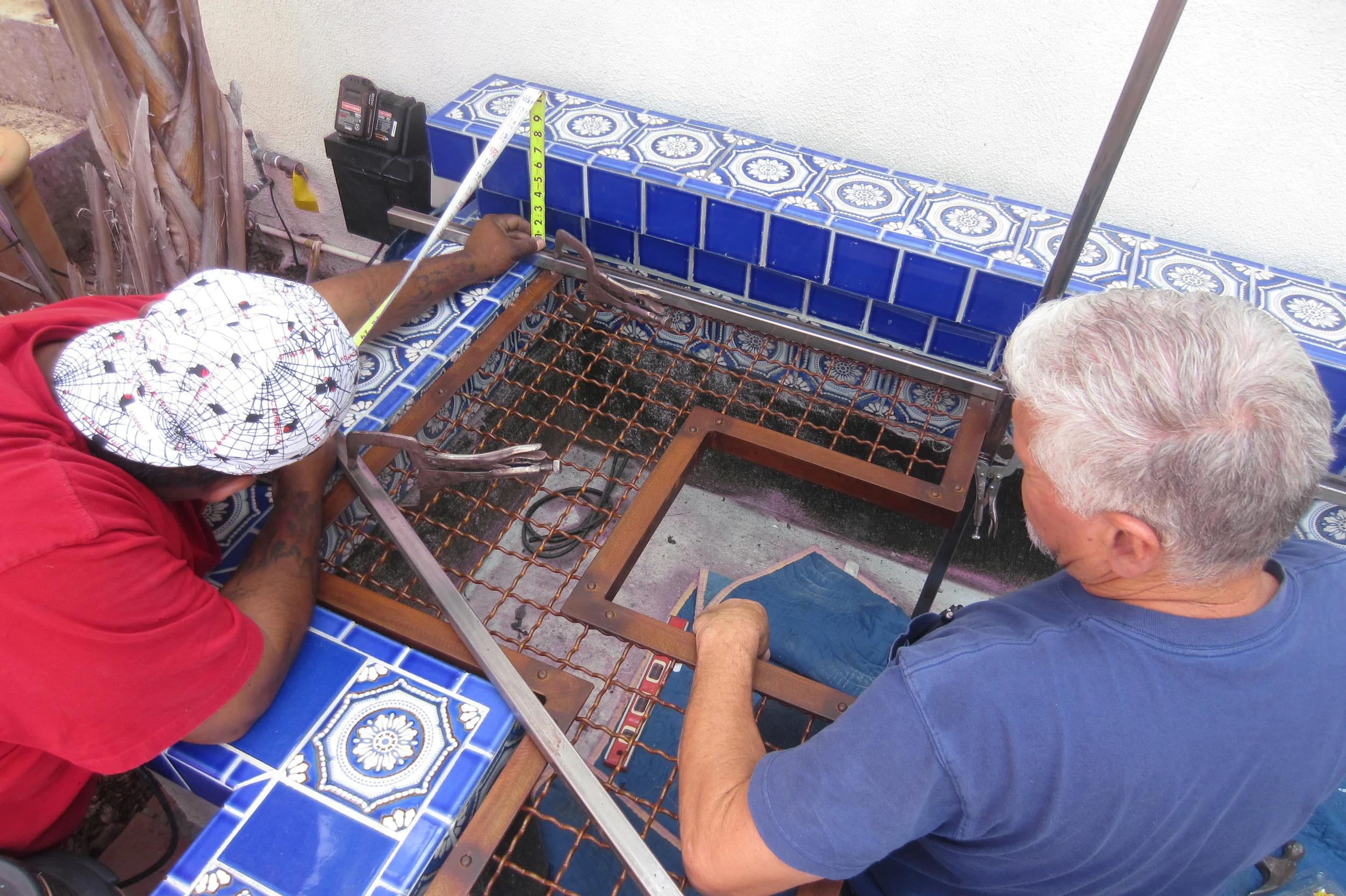 willy and Julio very carefully measured and calculated where they would be mounting the brackets to support the grill. By placing the screws in the grout no damage was done to the lovely tile surround.